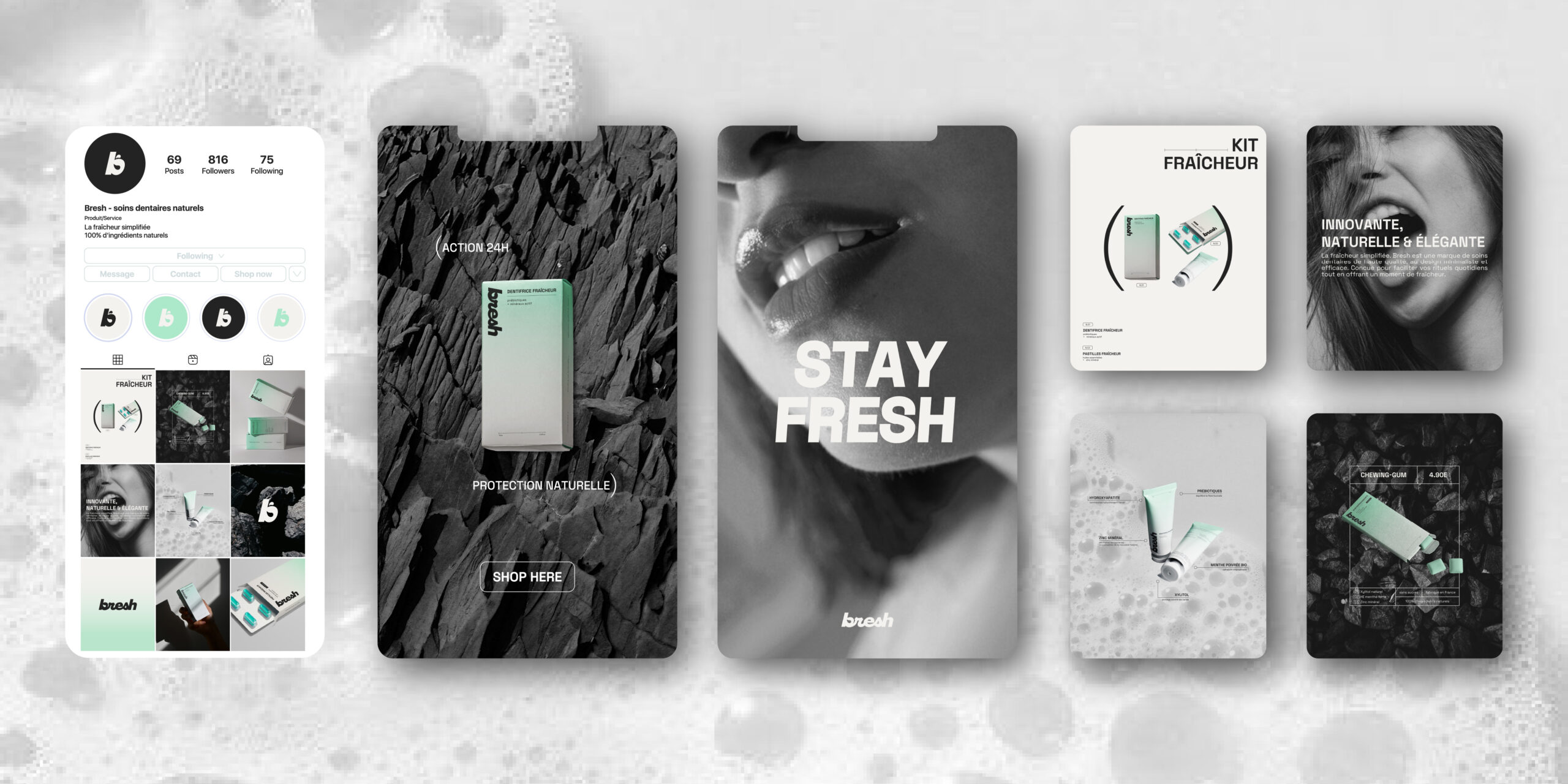 Bresh est une marque de soins dentaires qui réinvente le quotidien avec une approche minimaliste, efficace et esthétique. Pensée pour les jeunes adultes urbains, elle mêle design épuré, fraîcheur et conscience écologique.